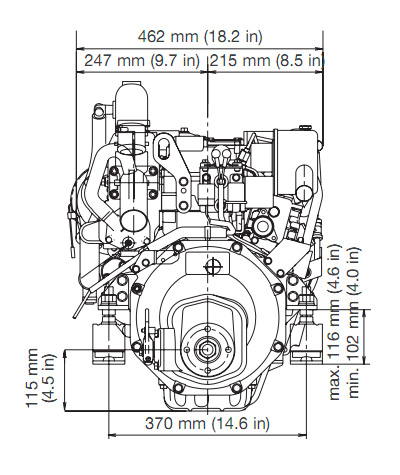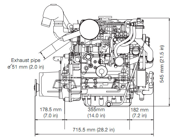 Engine Type: 4-stroke, vertical, water cooled diesel Displacement: 1.115 L (68 cu in) Bore x Stroke: 76 mm x 82 mm (2.9 in x 3.2 in) Prop Shaft Horsepower: 21.3 kW (29.1 mhp) / 3600 rpm Cylinder Heads: 3 Fuel/Induction System: Indirect injection Fuel: Diesel Starting System: Electric starting 12 V – 1.4 kW Lubrication: Enclosed, forced lubricating Weight: 123 kg (271 lbs)
